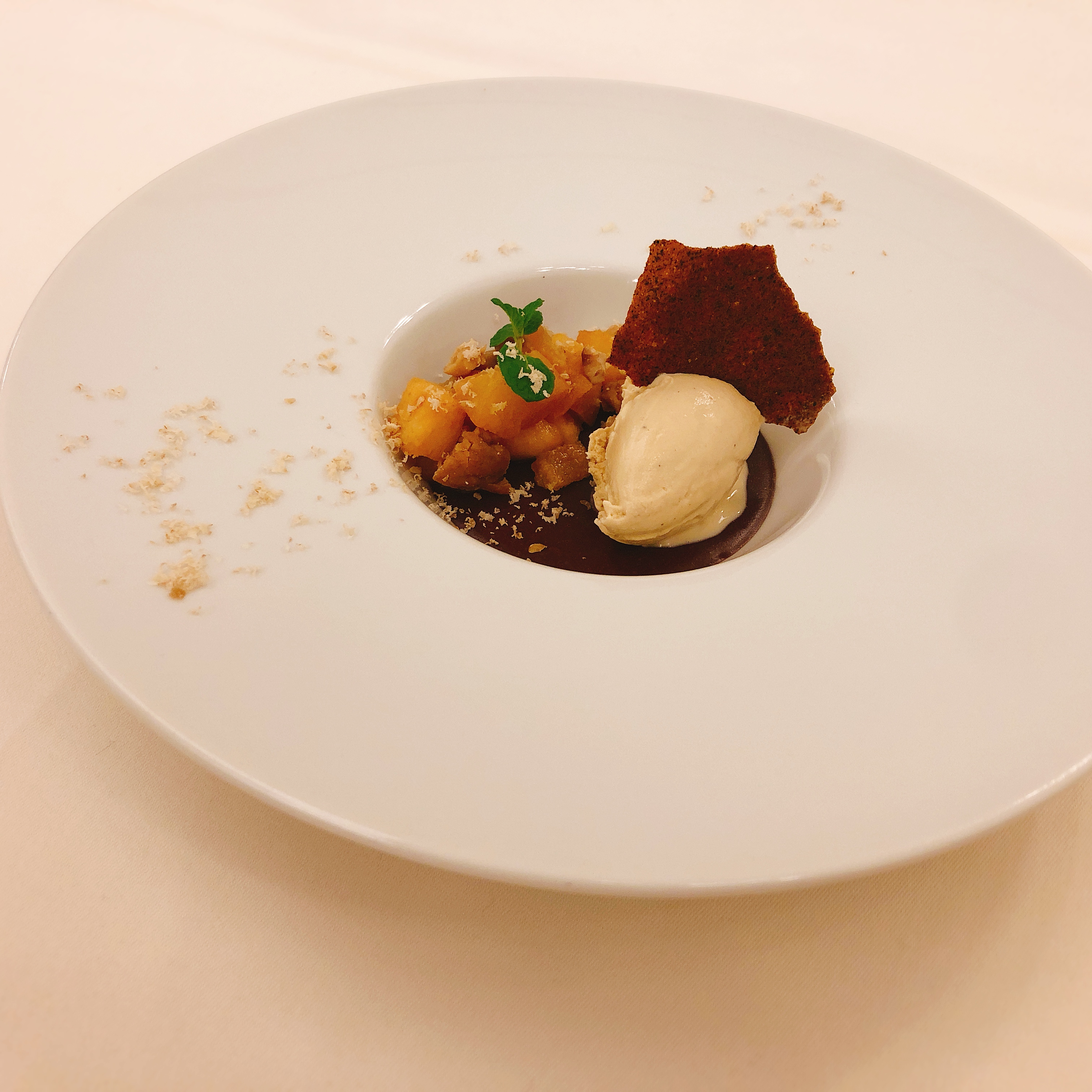 キャラメリゼにした洋梨と、シャリシャリとした食感とみずみずしさの和梨をアクセントに、焙じ茶で作ったアイスクリームがムースと良く合います。
