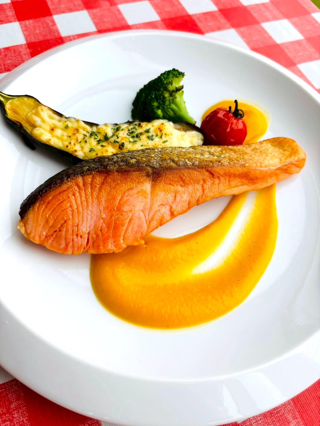 香ばしく焼き上げた旬の秋鮭と、ほんのりバターの香るカボチャのクリーミーなソース。