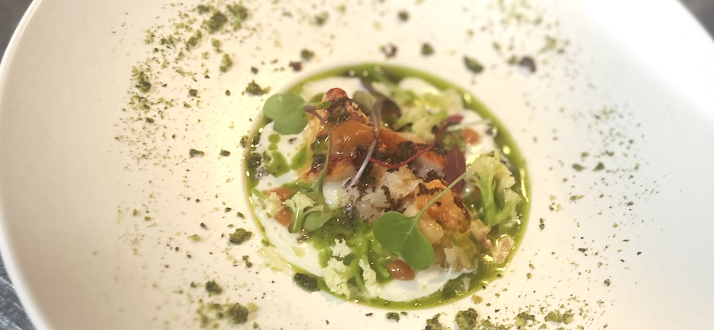 車海老を包んだラヴィオリや蕪の葉のパン粉、春菊のオイル、押し麦と一緒に盛り付け様々な食感、風味をお楽しみ頂けます。